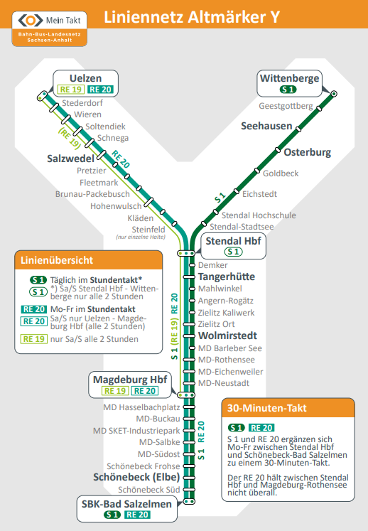 Das derzeitige Angebot ist seit rund 15 Jahren weitgehend unverändert und entspricht nicht mehr den Ansprüchen an einen flexibel und spontan nutzbaren Nahverkehr. Im neuen Konzept fahren sowohl S 1 (Wittenberge – Stendal – Schönebeck) wie auch RE 20 (Uelzen – Stendal – Schönebeck) stündlich. Beide Bahnlinien werden Y-förmig Richtung Schönebeck zusammengeführt. Im gemeinsamen Abschnitt zwischen Stendal Hbf und Magdeburg Hbf überlagern sie sich zu einem 30-Minuten-Takt; montags bis freitags sogar bis Schönebeck-Bad Salzelmen. Der RE 20 fährt zwischen Magdeburg-Rothensee und Stendal Hbf beschleunigt mit nur drei Zwischenhalten in Tangerhütte, Wolmirstedt und Zielitz Ort.
