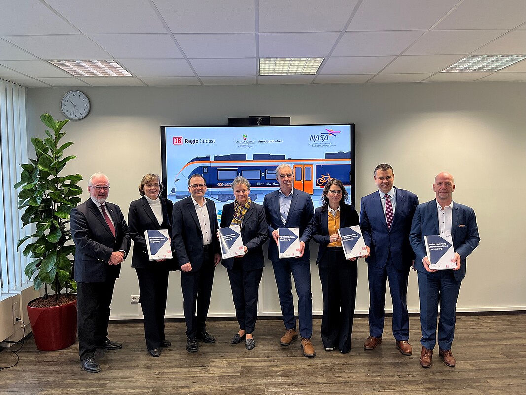 Zur Unterzeichnung des Verkehrsvertrages trafen sich (v.l.n.r.) Christian Berndt, Geschäftsführer LNVG, Carmen Schwabl, LNVG, Peter Panitz, Geschäftsführer NASA GmbH, Dr. Lydia Hüskens, Verkehrsministerin Sachsen-Anhalt, Ralf Sygusch, Verbandsdirektor Regionalverband Großraum Braunschweig, Christine Singer, Vorsitzende der DB Regio Südost, Frank Bretzger, Leiter Vertragsmanagement DB Regio Südost und Thomas Dill, Bereichsleiter Center für Nahverkehr- und Qualitätsmanagement des VBB.